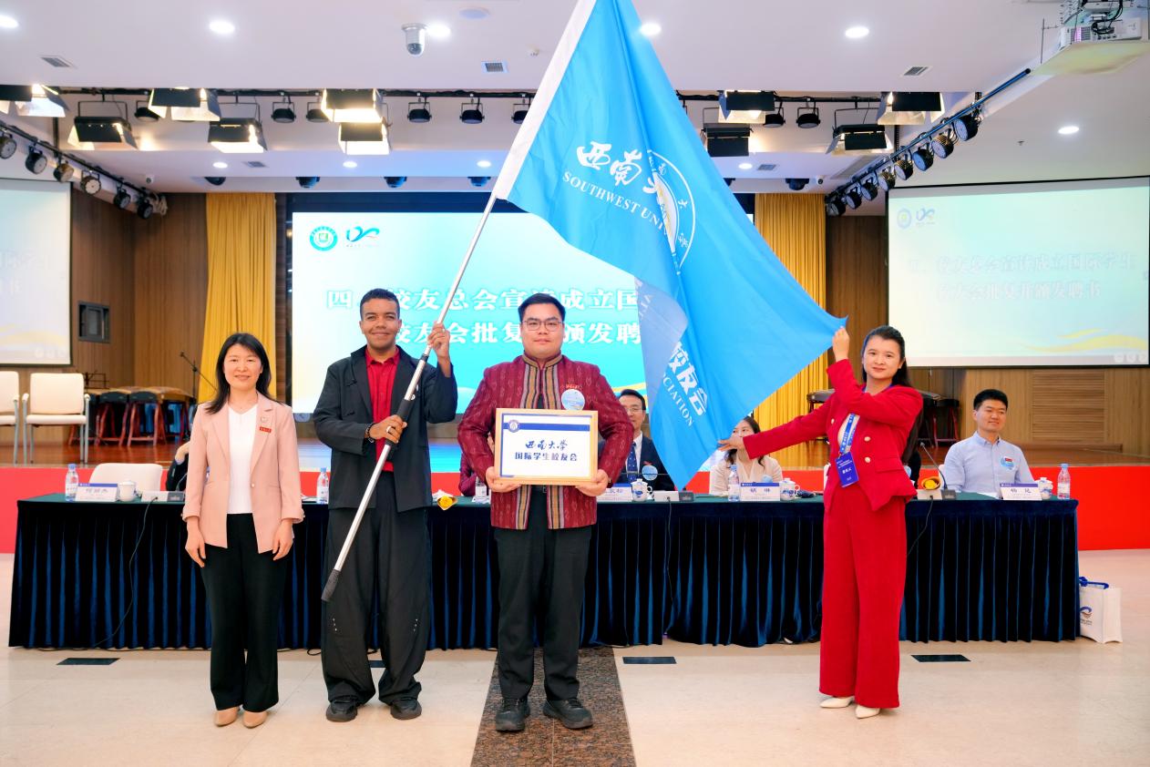 西南大学国际学生校友会成立 2026-04-20 2026年4月18日,西南大学国际学生校友会成立仪式在国际学院报告厅举行。副校长赵玉芳、国际学院党委书记张袁松、副院长胡琳及百余名国际学生校友和在校国际学生代表出席成立仪式。国际学院副书记耿军主持。学校外联办副主任、校友总会副秘书长陈建英宣读《关于同意筹备成立西南大学国际学生校友会的批复》,颁发会牌、会旗,并为首届校友会会长罗俊勇(泰国)、副会长黎氏云(越南)、秘书长黄阿里(埃及)颁发聘书。罗俊勇会长...