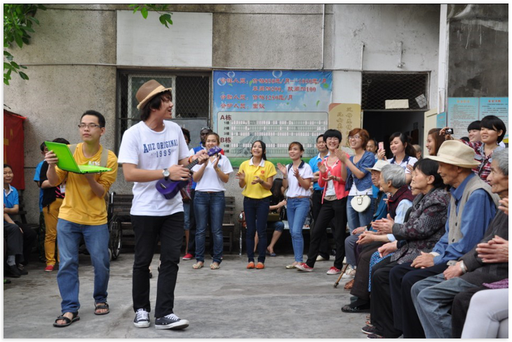 留学生们的到来受到了养老院院长和老人们的热烈欢迎。留学生们为老人献上了一场自编自导的文艺演出,婀娜多姿的"莲花舞",热情洋溢的"爱是美梦"等具有浓郁异域民族特色的节目,赢得了老人们的阵阵掌声。之后,留学生和老人们进行了亲切的交谈,认真倾听公公、婆婆讲述个人经历,深刻感受到中国改革开放后翻天覆地的变化,同时,他们也将自己在中国的学习生活以及自己国家的风土人情与老人们进行了交流。虽然来自不同国度,但真诚和善良让留学生和老人们的心紧紧联系在了一起。最后,大家一起合影留念,记录下这美好的一刻。国际学院的教师代表向养老院赠送了微波炉和其他礼物。傍晚时分,留学生们与老人依依惜别,一些同学还情不自禁地留下了激动的泪水。