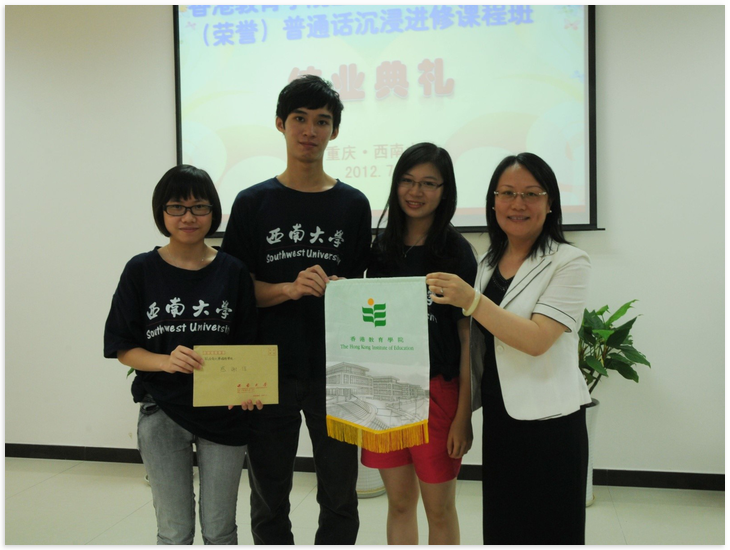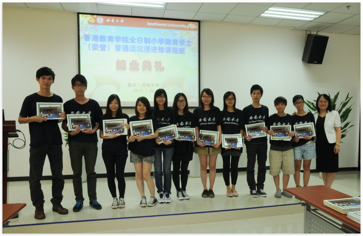 2012年7月20日下午,香港教育学院全日制小学教育学士(荣誉)普通话沉浸进修课程班结业典礼在西南大学国际学院隆重举行。港澳台办公室主任、国际学院院长王静博士,港澳台办公室副主任、国际学院副院长刘猛博士,著名语言学专家翟时雨教授,教师代表和三十余名学员参加了此次结业典礼。结业典礼由廖卡娜主持。