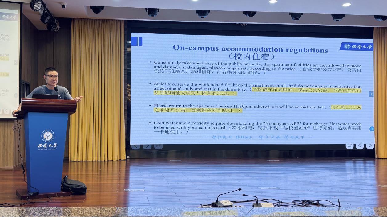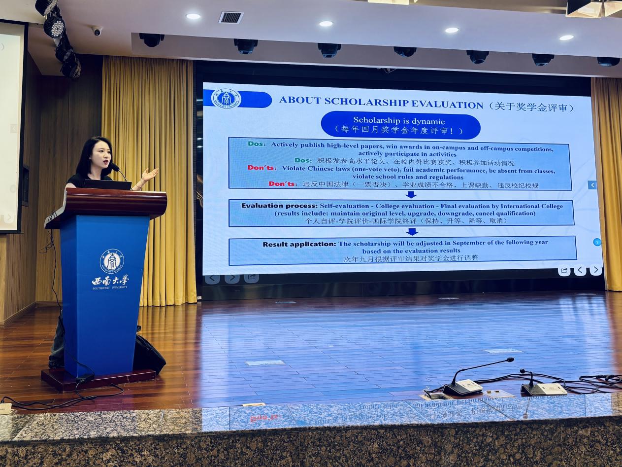 国际学院学生工作办公室主任杨凌霄首先向新生介绍科室成员,帮助新生初步认识学院学生工作团队。她向新生展示《西南大学国际学生手册》,要求新生认真阅读、知悉并遵守手册规定;同时就来华留学生奖学金进行讲解,明确各类奖学金资助标准。