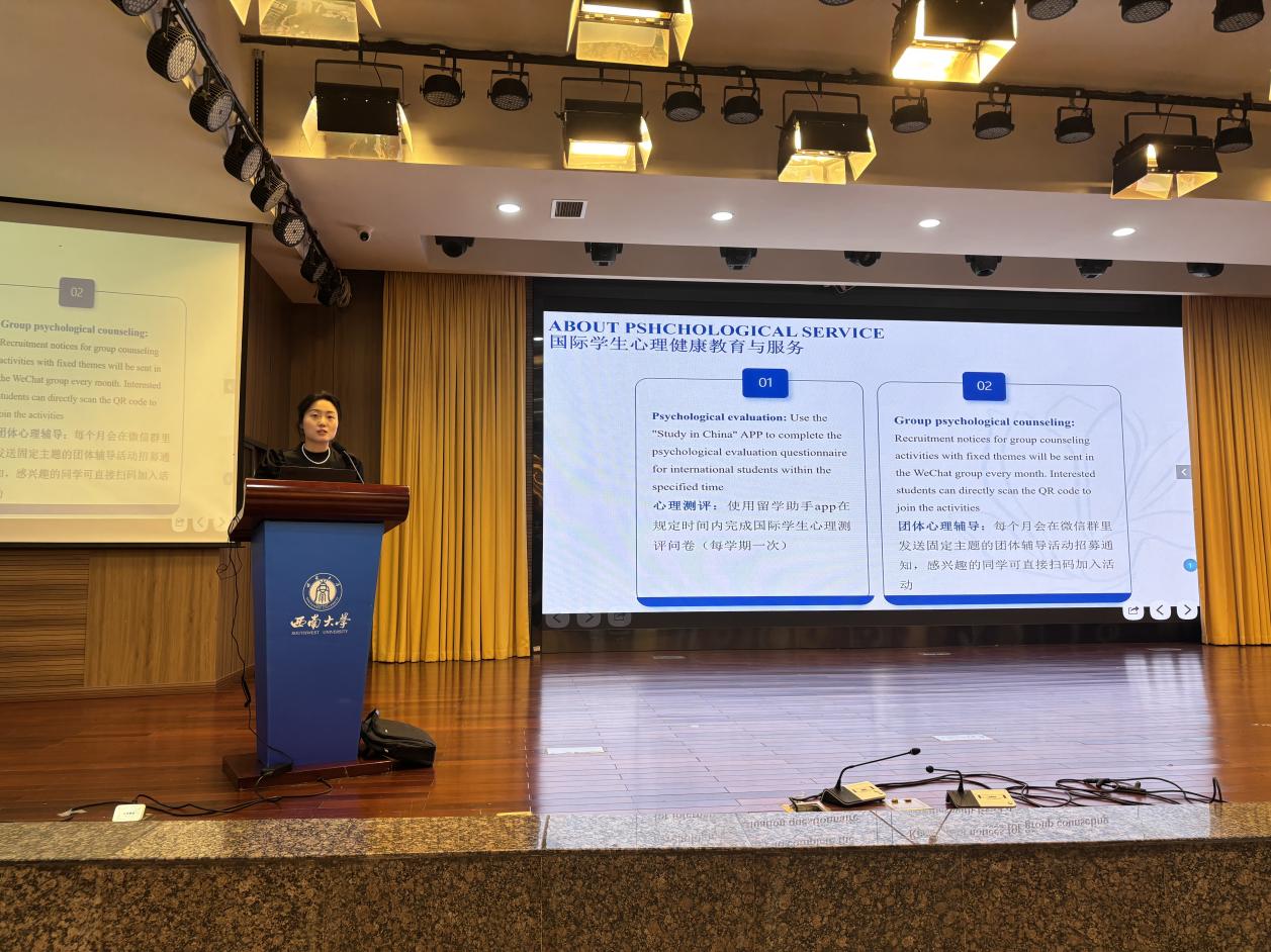 辅导员景柯沥老师详细介绍国际学生的心理健康服务和形式多样的主题心理团辅活动;同时着重讲解国际学生请销假制度,确保新生明晰请假流程与要求。