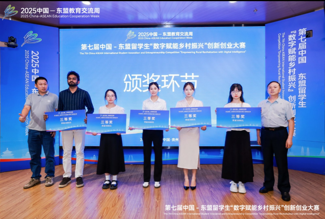 2025年9月12日,第七届中国-东盟留学生“数字赋能乡村振兴”创新创业大赛在贵州大学落幕。我校留学生参赛项目表现亮眼,共获1项一等奖、1项三等奖、2项优秀奖。