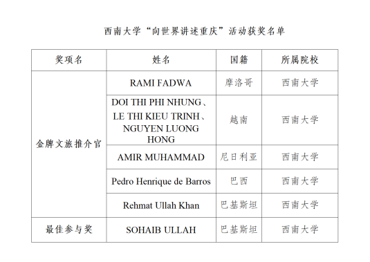 据悉,所有获奖学子均被纳入重庆市“国际人才推广库”,其中“金牌留学生推介官”获得者将拥有一年聘期(2026年1月1日至12月31日)。未来,他们将以西南大学学子的身份,优先参与重庆市各类文旅交流推广及非遗体验活动,持续创作优质作品,在国际舞台上继续发出“重庆声音”“中国声音”,为推动重庆城市形象的全球传播贡献西大力量。
