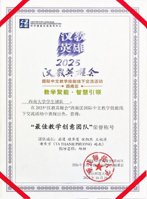 在交流活动中,西南大学国际学院学生团队凭借出色的教学设计与精彩的现场展示脱颖而出,荣获“最佳教学创意团队”称号,并成功晋级全国总交流活动。这是我校学生团队在该项赛事中取得的新突破,充分展示了西南大学在国际中文教育领域的综合实力与创新活力。