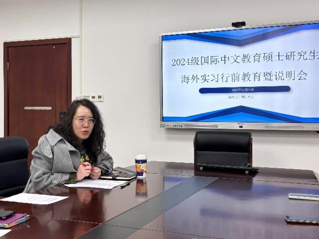 12月29日下午15:00,2024级国际中文教育硕士研究生海外实习行前教育暨说明会在学院304会议室召开,学院党委副书记耿军,汉教系陈晨老师、舒敬斌老师出席,研究生辅导员杨凌霄主持,2024级汉硕海外实习生代表参会。