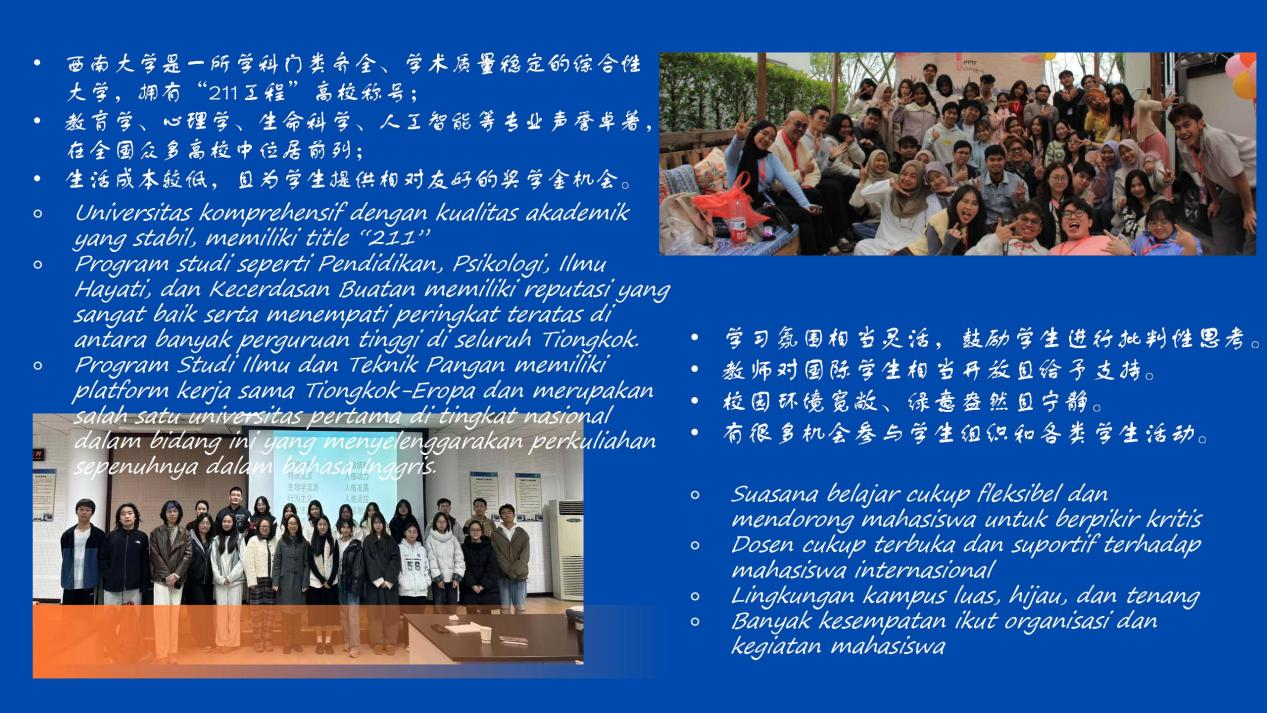 宣讲会上,王鹊介绍了重庆和学校概况,详细介绍了西南大学办学实力和奖学金政策,以及2026年自费本科专业。印尼籍心理学部大二学生、重庆市在华印尼学生协会的主席庾绘美里(EMILY YEE)分享了真实的“西大印象”。