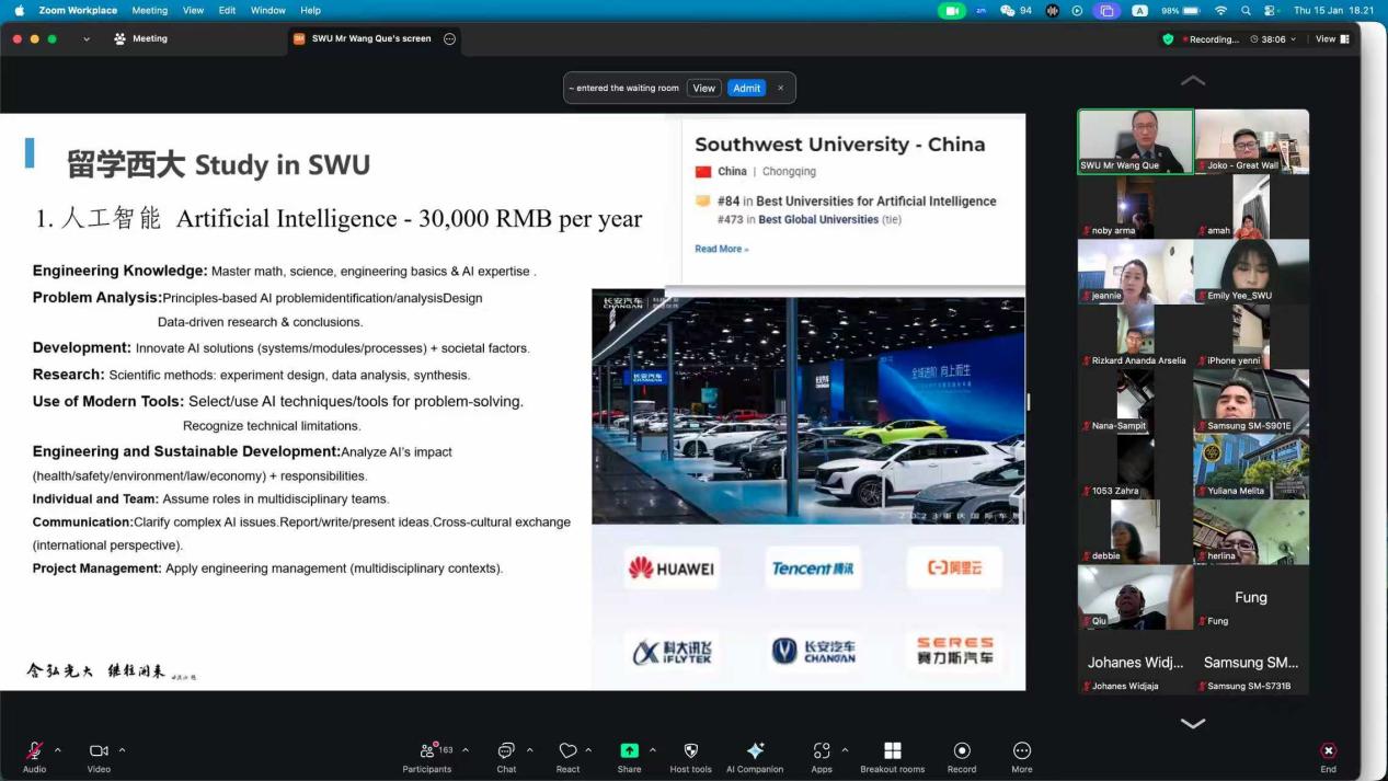 1月15日晚,学院联合印尼长城机构成功举办线上招生宣讲会。活动面向印尼高中生及家长,在线人数超200人,现场气氛热烈,成效显著。