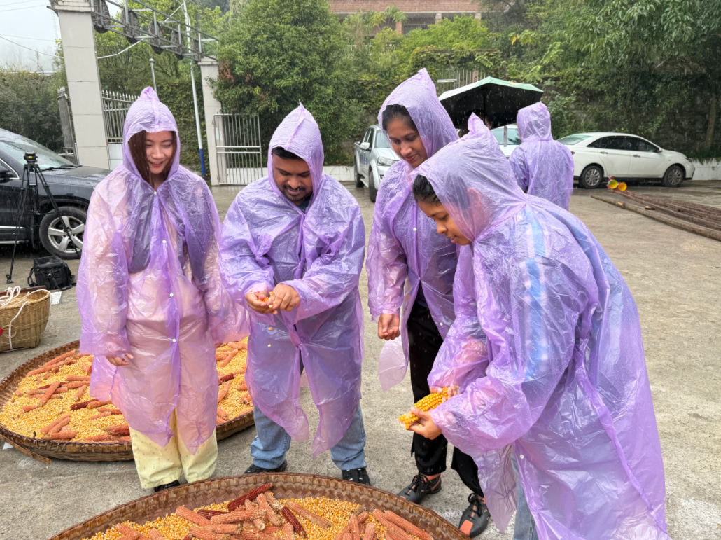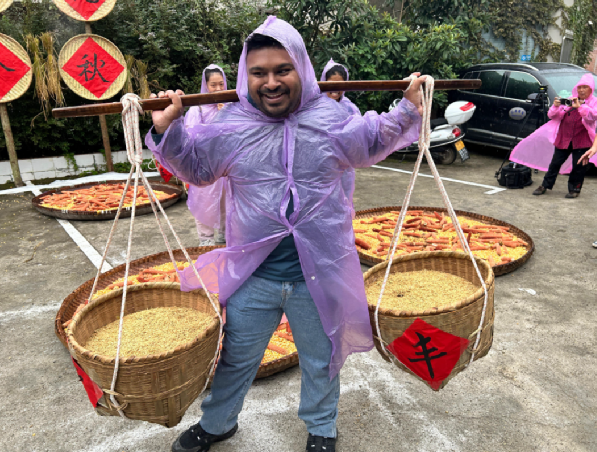 活动中,留学生们积极参与多项农业体验活动。在农民趣味运动会中,他们加入剥玉米、扁担挑粮接力等比赛项目,现场气氛热烈。此外,留学生们还走访当地特色民宿,参与传统手工艺制作,感受乡村旅游的发展成果,并品尝农家腊肉、糍粑等特色美食。
