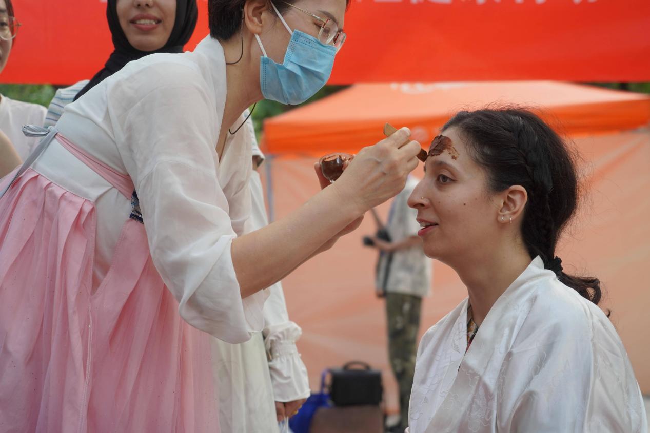 活动精心打造了八大主题沉浸式体验区。“中医口腔馆”,留学生们探索“齿为肾之余”的养生智慧,学习口腔保健与全身健康的关系;“草药香囊铺”延续传统,参与者亲手制作蕴含“芳香避秽、扶正祛邪”理念的香囊;“中医美容铺”展示了中医“以内养外”的美容观,介绍药食同源、经络按摩对肤色的调理;在“中医养眼馆”,体验者了解了“肝开窍于目”的理论,学习眼保健操及养肝明目的食疗方;“中医康复体验铺”则让参与者亲身感受推拿、艾灸、拔罐等非药物疗法舒筋活络、调和气血的功效。此外,新增的“草药辨识区”和“中医义诊区”让大家近距离接触百草,体验“望闻问切”的诊疗智慧,而“传统药具展”则生动呈现了中医药发展的历史脉络。
