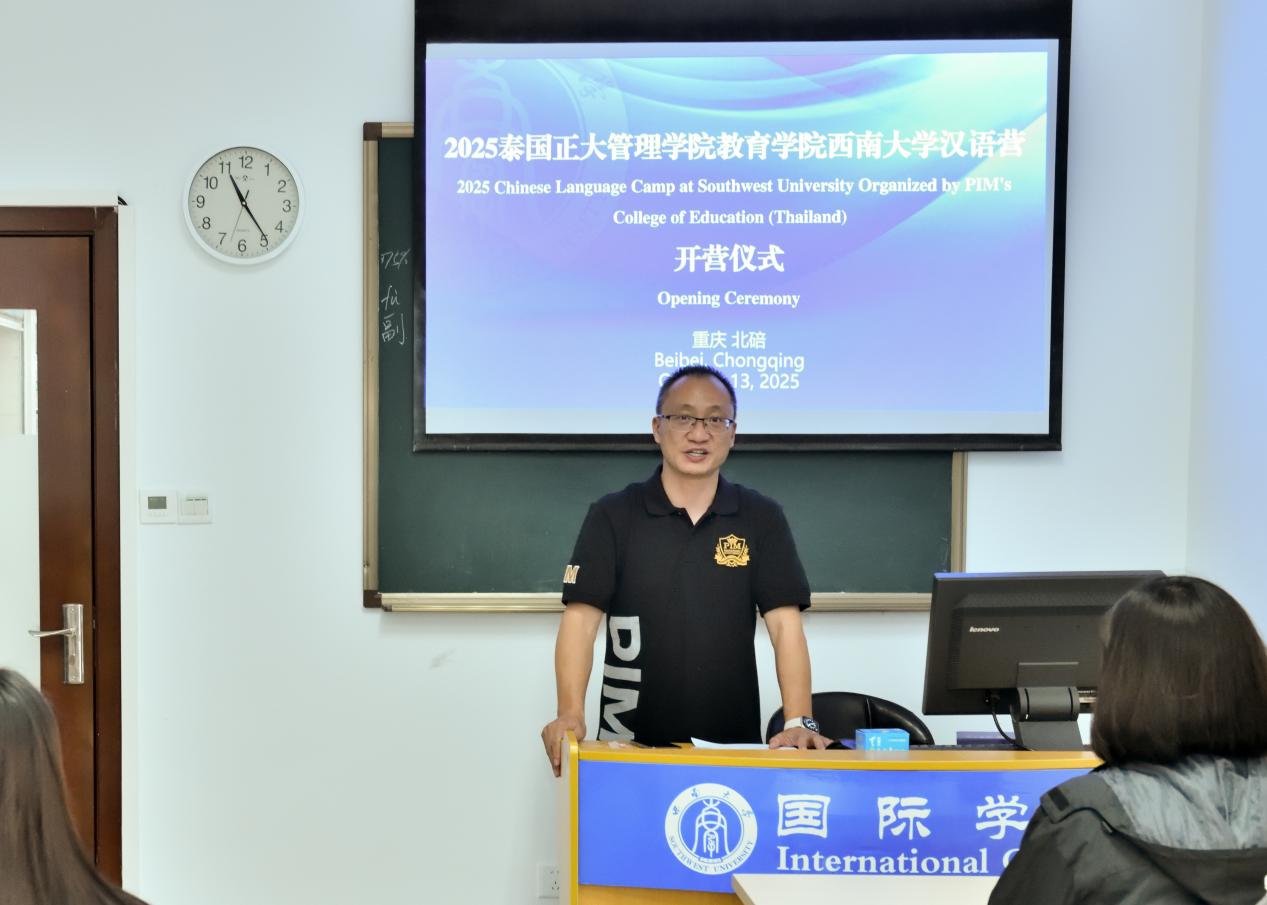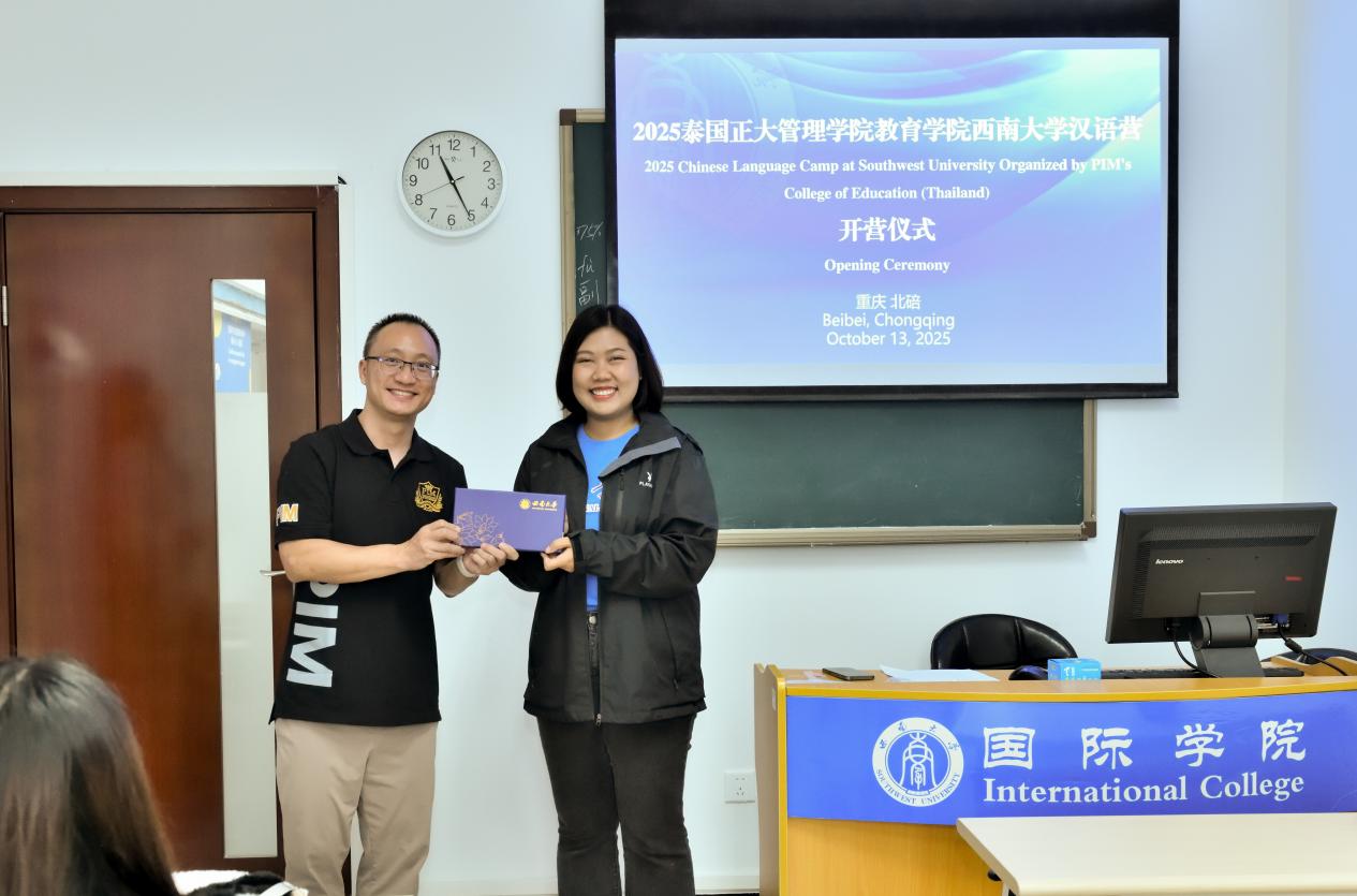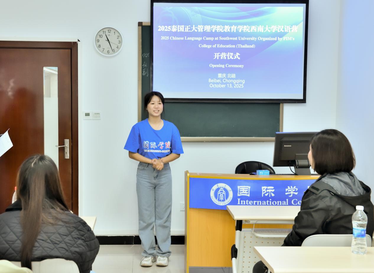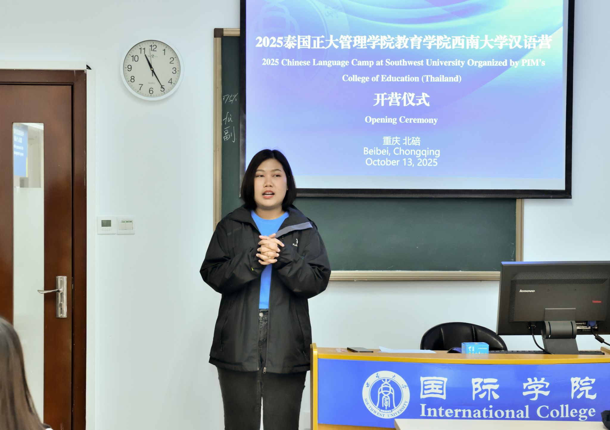 10月13日上午,“2025年泰国正大管理学院教育学院西南大学汉语营”开营仪式在国际学院紫云楼举行。国际学院招生办公室王鹊,泰国学生助理秦以悦,泰国正大管理学院教育学院陈靓颖老师和13名营员参加开营仪式。仪式由王鹊主持。