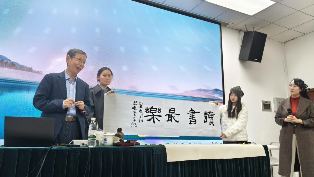 讲座尾声,崔希亮教授亲笔题写繁体“读书最乐”四字赠予国际学院,以墨宝寄寓期许。其书法笔力遒劲、意蕴深长,不仅彰显了学者风范,更将中华传统文化中崇尚阅读、以学为乐的精神凝结于翰墨之间,为本次讲座留下了隽永的文化注脚。这份珍贵的礼物,承载着对学院师生勤读善思的殷切勉励,也为整场学术活动画上了圆满而富含书香的句号。