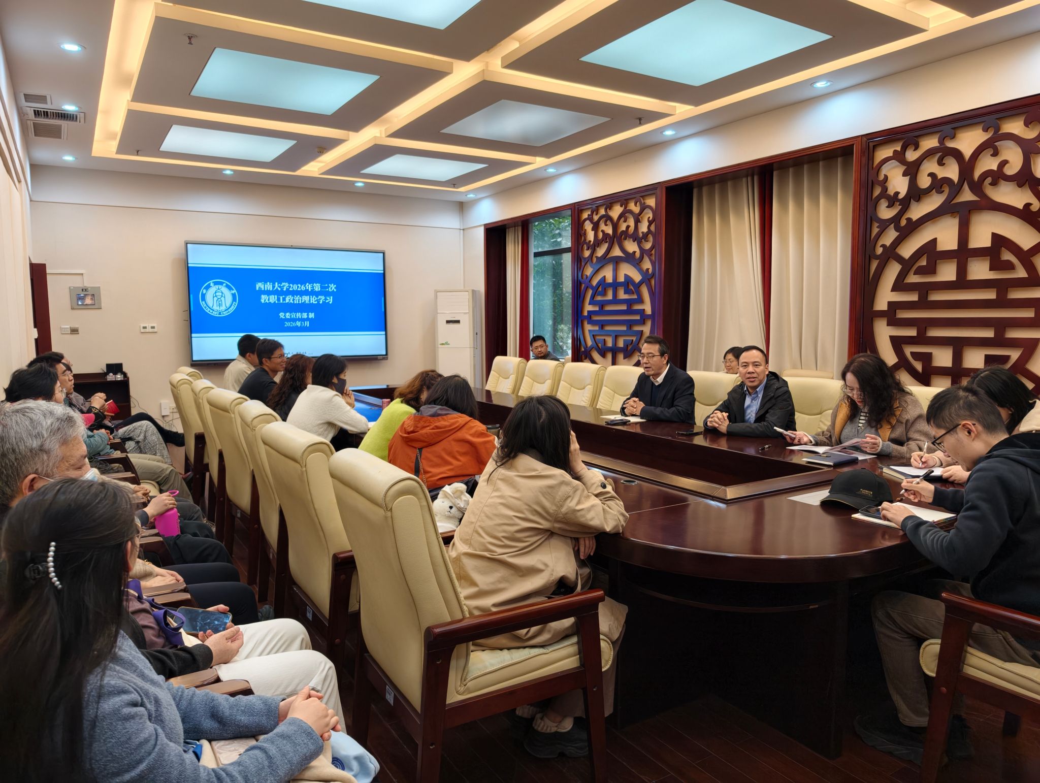 2026年3月6日下午,国际学院在签约室召开 2026年第二次教职工政治理论学习会。本次会议由张袁松主持,林千彭、王菁、但金凤三位老师分别围绕不同主题进行深入导学和分享,全体教职工积极参与学习。